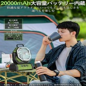 キャンプ扇風機は20000mAhの超大容量のリチウムイオンポリマー電池を内蔵され、1回フル充電時で、最小モードで58時間連続使用が可能です。最大モードでも約15時間の連続使用が可能です。コードレス・充電式扇風機はコンパクトで、収納可能な取っ手も追加し、楽々持ち運びられます。室内はもちろんキャンプや車中泊などの屋外でも活躍します。キャンプ 扇風機は「出入力ポートやLEDライトも付いているので、キャンプで急な電池切れや台風の停電の際に役立つようになります。緊急停電時とキャンプ用品として最適です。1台で多彩な用途に対応します。