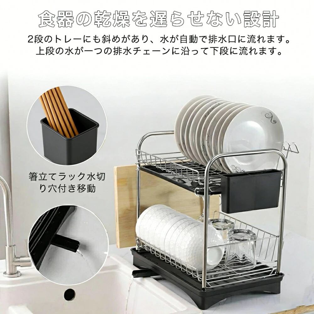 【優れたデザイン】 通気性がよく、食器が早く乾燥でき、防カビ防菌に役立ちます。より高いガードレール食器が落ちません。トレイに排水口が低い所に設置され、水が流れます。更に、排水樋が伸縮して360度回転可能で、水きりラックが何処に置いて排水樋がシンクに向いて排水できます。