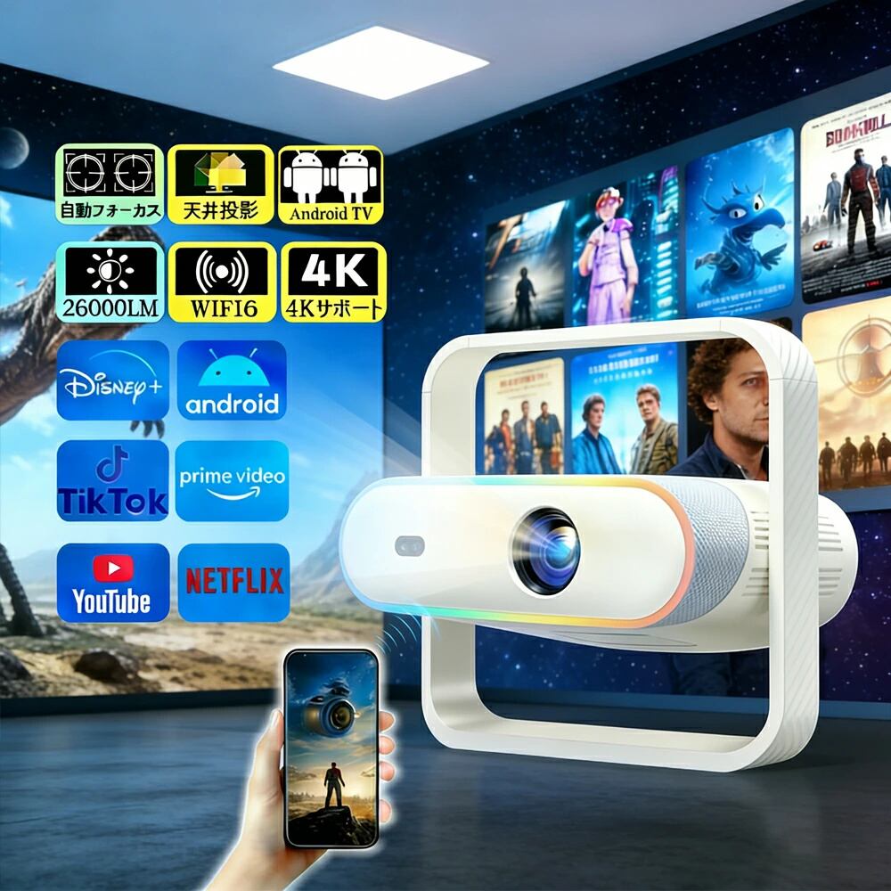 プロジェクター 小型 家庭用 天井投影 スマホと繋げる 1080P&4K対応 高画質 35000LM 自動フォーカス ホームシアター 壁 簡単設定 自動台形補正 高輝度 Netflix YouTube android搭載 スマホ 高画質静音 5G WIFI6 Bluetooth5.4