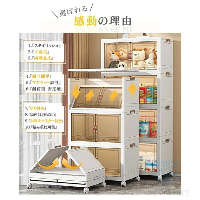 両開きと上蓋との2way式。積み重ねて使用しても扉を開けて簡単にアイテムを取り出せます。