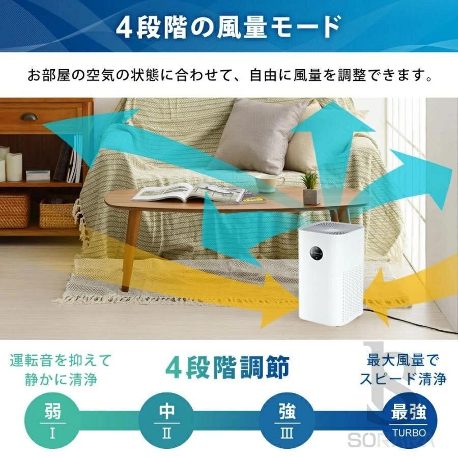 【風量4段階切り替え】 お部屋の空気の状態に合わせて、周り環境の空気質より作動効率が違って過熱安全保護の為、長時間(24時間以上の連続稼働)の使用