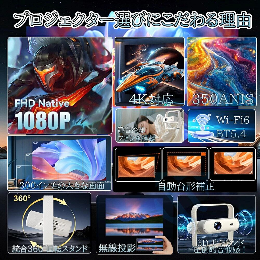 プロジェクター 小型 家庭用 天井投影 スマホと繋げる 1080P&4K対応 高画質 35000LM 自動フォーカス 自動台形補正 高輝度 Netflix YouTube android搭載 スマホ 高画質静音 5G WIFI6 Bluetooth5.4 ホームシアター 壁 簡単設定