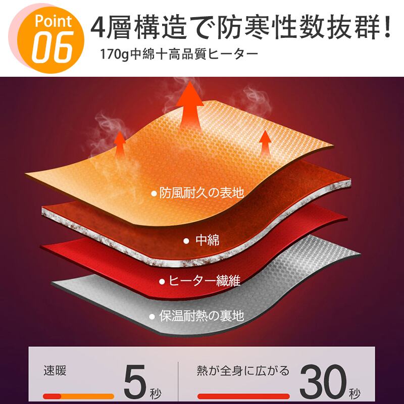 ※電熱ベストには恒温保護作用があります。プラグを挿してから3-5分后、自働的に高温から低温に切り替わります。これは正常な現象です再度高温モードでご利用の場合は再度高温モードを手動で設定してください,その後ずっと高温の状態です。長時間使用すると、自働で消灯したり、自働で低温状態になったりすることがあります。これは正常サーモスタット保護作用です。出てきたら、半分くらいのうちに、もう一度スイッチを入れてください。
